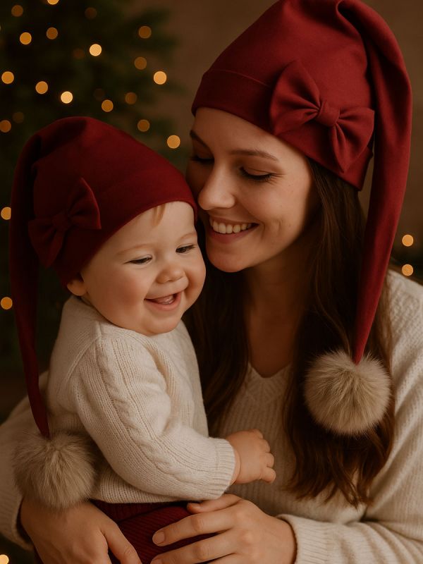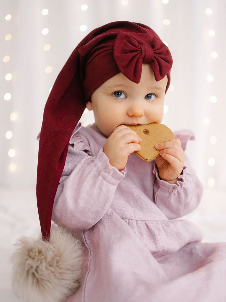 Vacker och mjuk tomteluva för bebisar och barn i nyansen Röd väcker julstämningen så fort du tar på dig den. Den elastiska tomteluvan är tillverkad av Öko-Tex100-certifierad bomull och passar perfekt även på de smås huvuden. Finns med eller utan en söt rosett – perfekt för julbilder och som present.