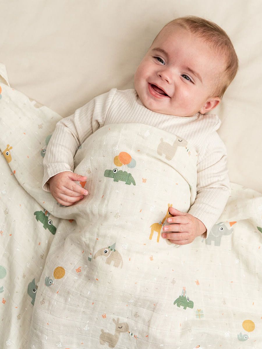 Det stora 120x120 cm stora Done By Deer - babylinda fungerar perfekt som inplastning, filt eller amningsöverdrag. Mjuk och andningsbar bomull gör den till en mångsidig favorit för barnets vardag.