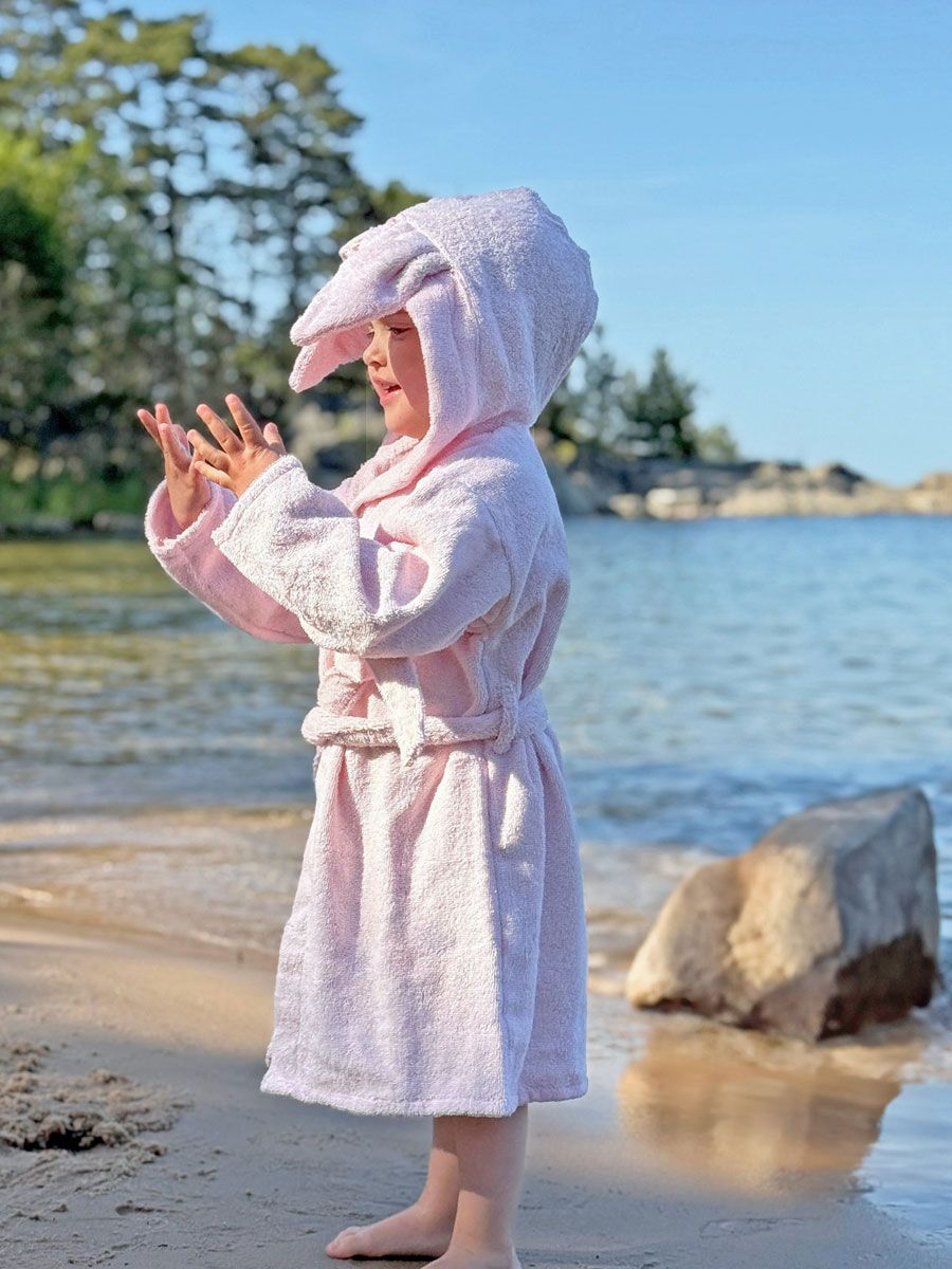 Supermjuk och lyxig Summerville -badrock med bedårande kaninöron. Handduken är gjord av ekologisk bomullsfrotté och är slät för ett barns känsliga hud. En badrock fungerar lika bra hemma efter ett bad som på stranden.