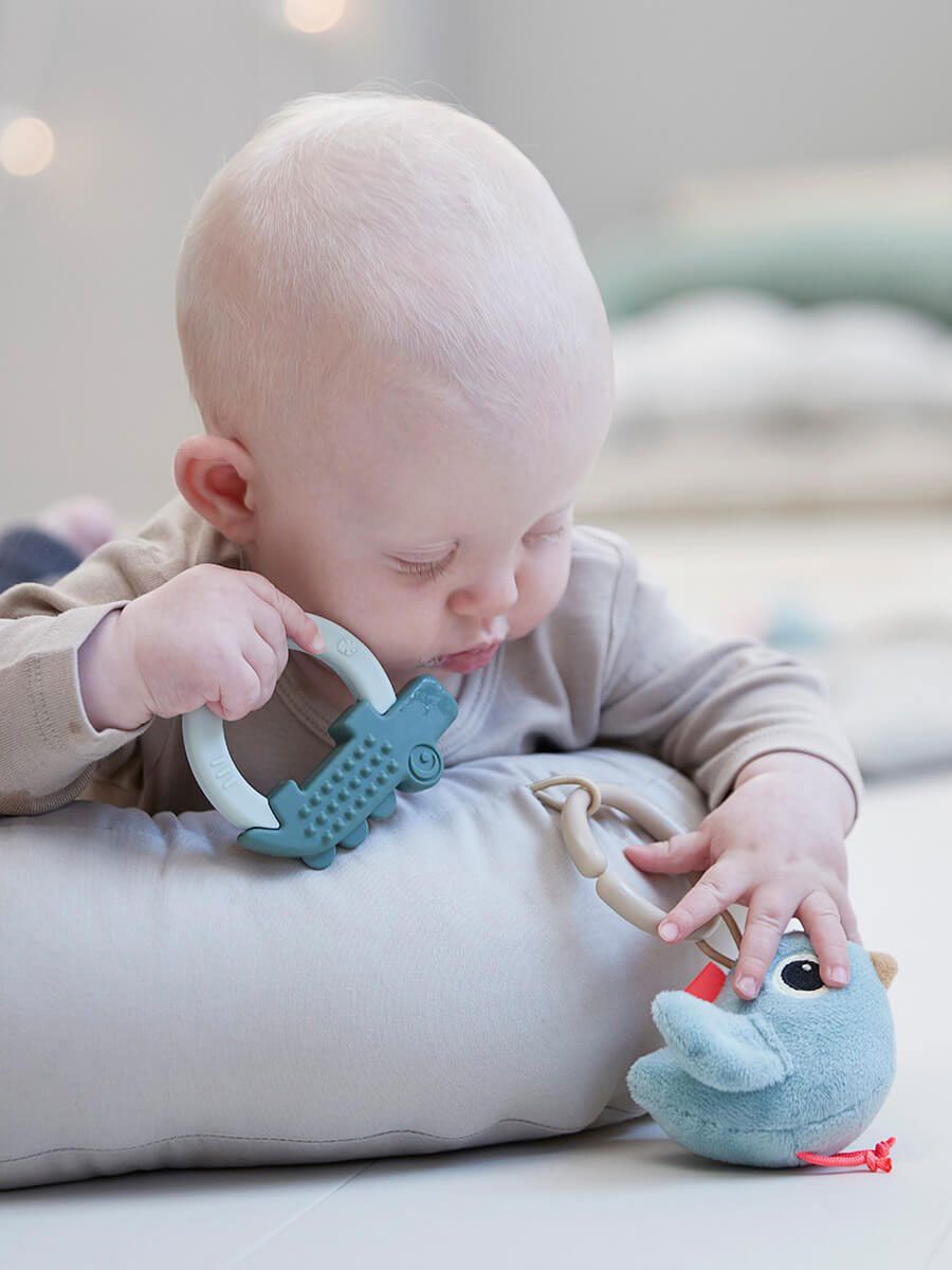 Bebisens favoritleksaker kan fästas på den avtagbara leksaksbågen. Det ekologiska bomullsöverdraget känns skönt mot huden. Överdraget är lätt att ta av och tvätta. Den mjuka ytan har en 3D-stoppning som gör att luften kan cirkulera under barnet.