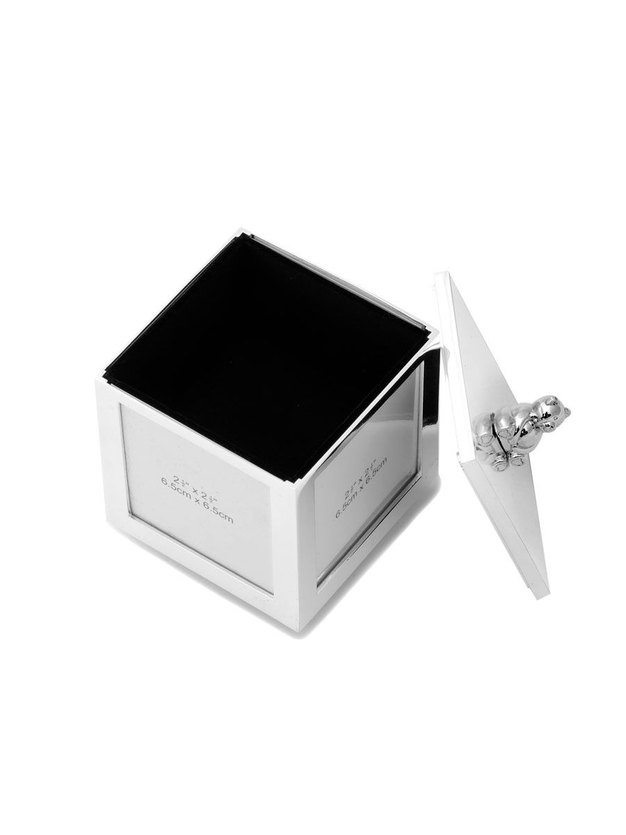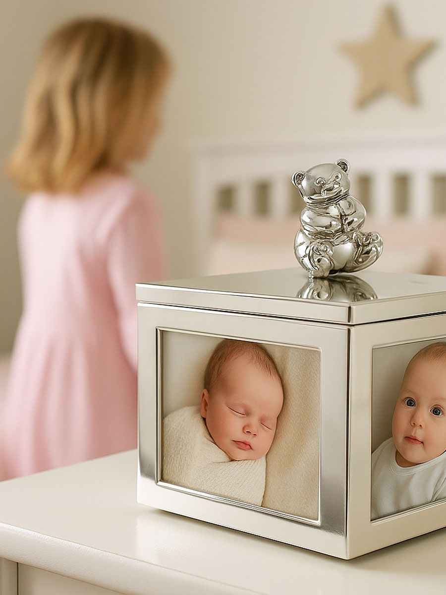 En fyrkantig silverpläterad speldosa med plats för bebisens första bilder på var och en av dess fyra sidor. En söt nallebjörn sitter ovanpå speldosan. Speldosan snurrar sakta runt och spelar den vackra "Good Evening, Good Night"-melodin. Under omslaget till speldosan hittar du ett ställe att förvara små minnen eller hemligheter.