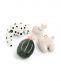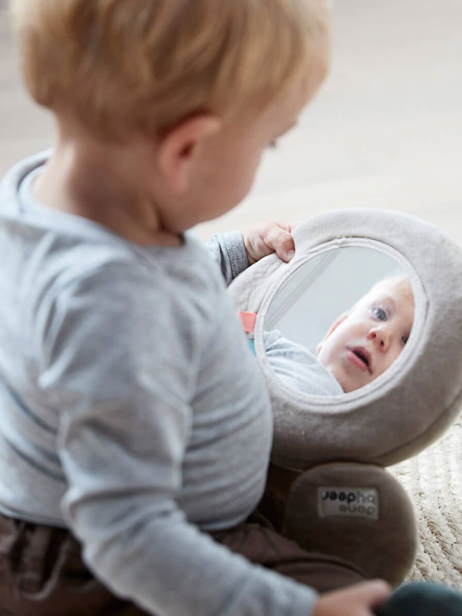 Gömsleberget och de små aktivitetsleksakerna är i mjuka nyanser av sand, blått, grönt och ett stänk av korallrött.