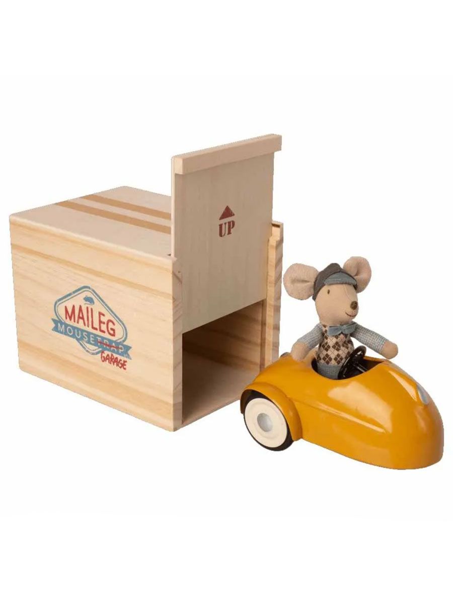 Mailegs charmiga racermus ger fart och berättelsebaserad lek in i ett barns vardag. Utrustad med en gul racerbil och ett eget garage är lillebror-musen redo för äventyr - både i barnrummet och i andra landskap i Mailegs värld.
