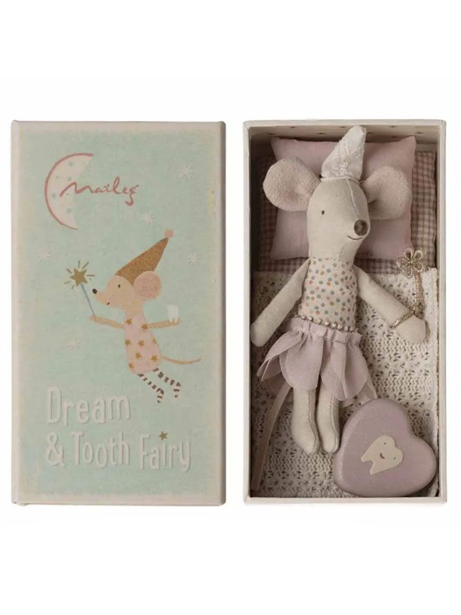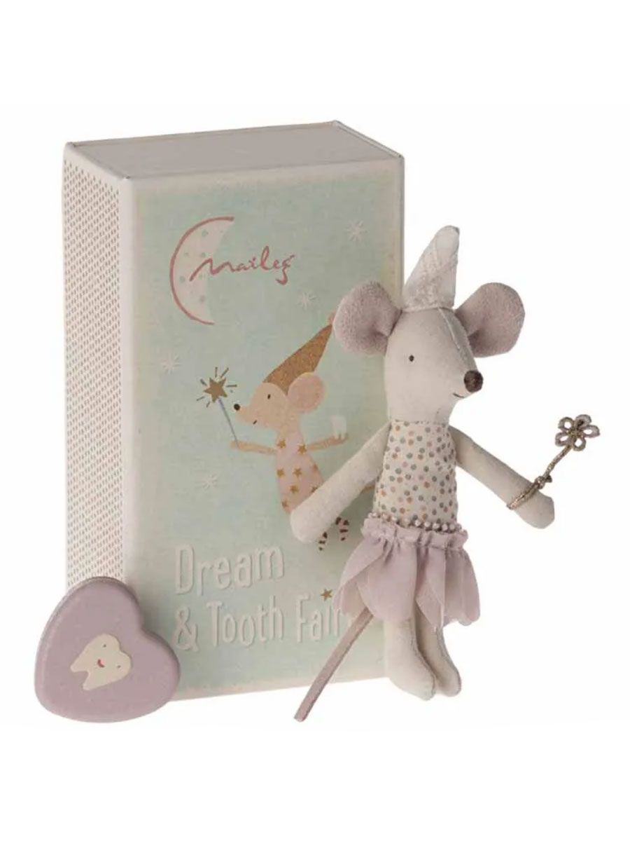 Den bedårande Maileg Tandfé-asksetet innehåller en liten mus, en vacker presentask och en tandask i metall för att samla de första mjölktänderna i. Ett perfekt minne och en underbar present till ett barn.