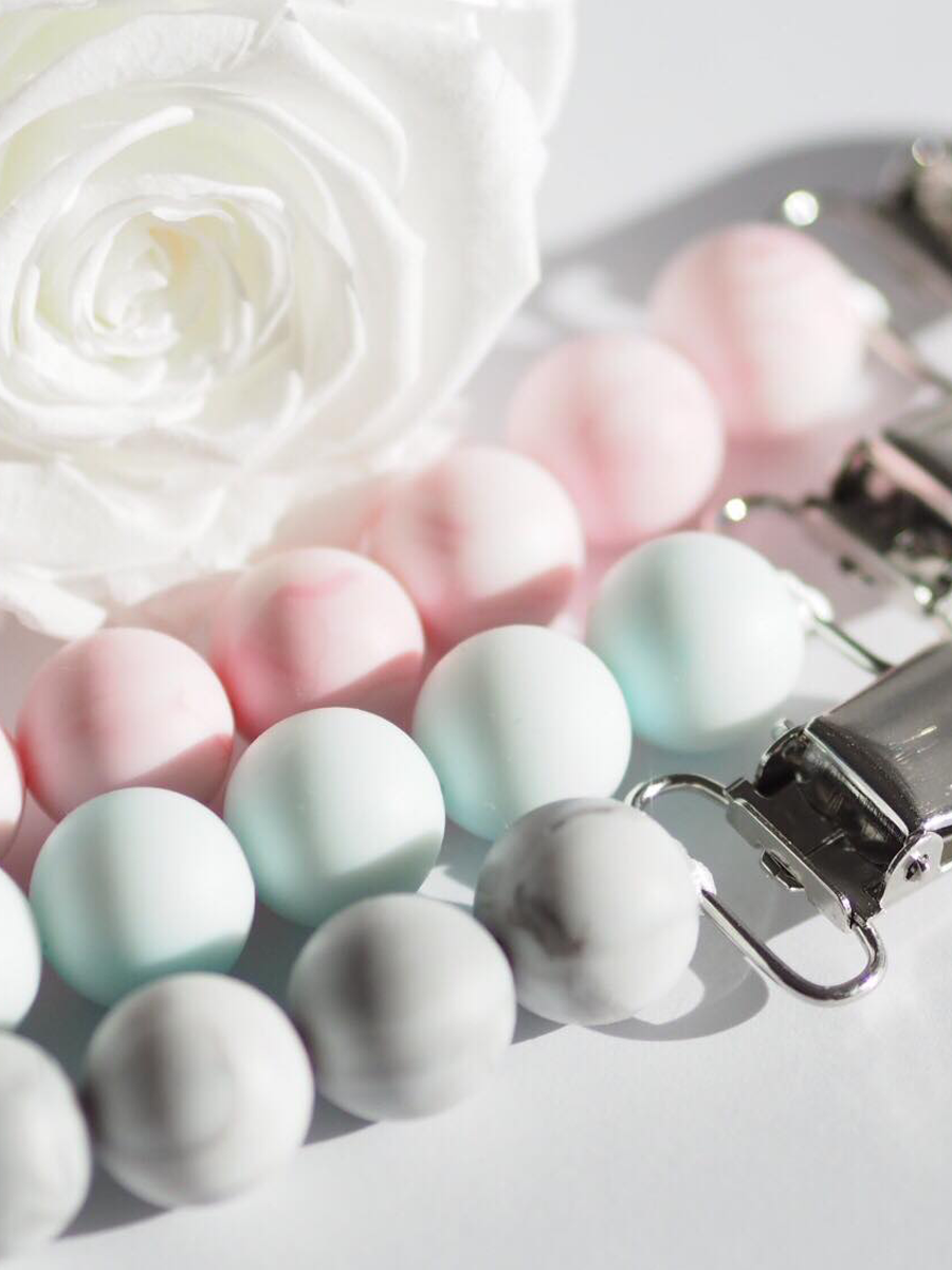 Vår trendiga, säker och god kvalitet napphållare. Napphållare håller nappen nära barnet. Napphållare förhindrar droppande, när nappen ofta blir smutsiga eller förloras. Napphållare är gjord av säkra BPA-fri mat silikon pärlor och ring. Metallclip fastsättning. Handtvätt med varmt tvålvatten .