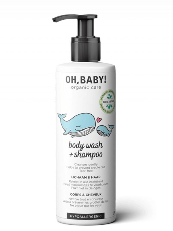 - Oh Baby! Kroppstvål och schampo 250 ml: Denna milda kroppstvål och schampo rengör, behandlar och mjukgör barnets hud och hår. Dess naturliga och hypoallergena ingredienser gör tvättningen trevlig och säker.