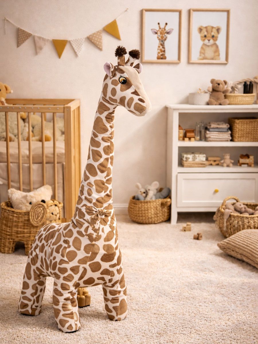 Barnrummets favorit - en mjuk, stor giraff. Giraffen håller sig väl upprätt, så den är lätt att placera som dekoration i barnrummet och i lekar – eller för ett barn att gosa. Perfekt till ditt eget barnrum eller som present
