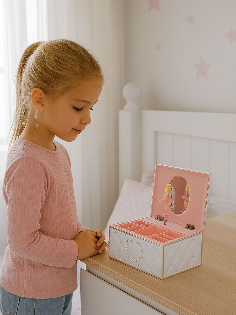 Öppna det silverpläterade smyckeskrinet och du kommer att höra den vackra melodin av Beethovens "Für Elise", som en vacker ballerina dansar till. Smyckeskrinet har två lager för smycken och att hålla hemligheter. Mjuk, rosa sammet håller smyckena i gott skick och repfria. Med spegeln inuti kan du omedelbart kontrollera hur dina örhängen, halsband och armband ser ut på dig.